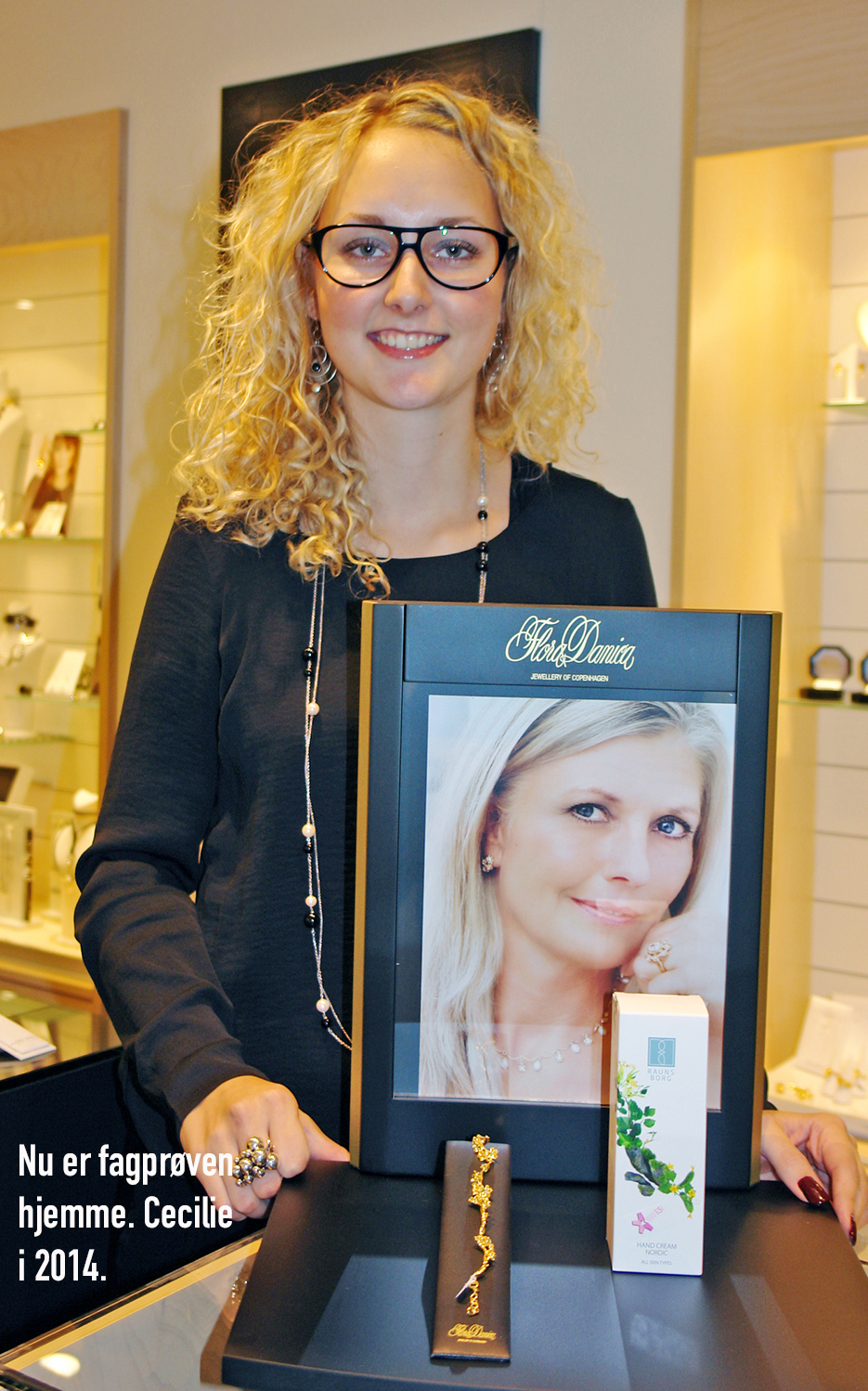 Cecilie, 34, har arbejdet hos Fangels i 14 år, og hun er født i Aarup, gik på Aarupskolen og bor i Aarup sammen med mand, to børn og en hund. Så hun kender selvsagt byen fra nord til syd og fra øst til vest, og hun kender arbejdsgangene i Bredgade-butikken, hun kender kunderne og uddannelsesmæssigt dækker hun to ud af forretningens tre ben, idet hun er udlært salgsassistent med speciale i sølv, guld og ure.