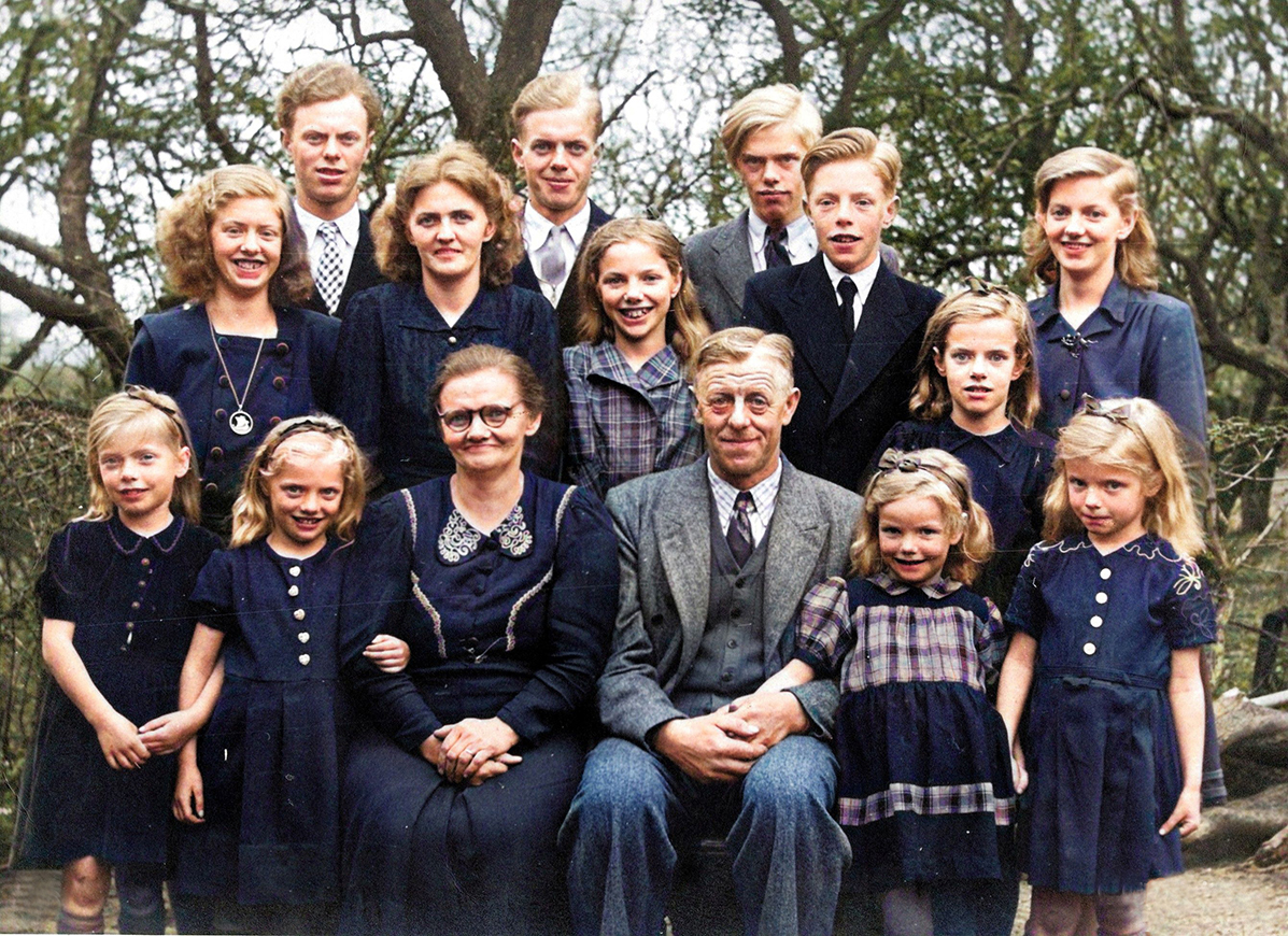 Forældrene Kathrine og Rasmus sidder forrest i midten. Ved siden af Kathrine står tvillingerne Rosa og Tove. Ved siden af Rasmus ses Magna og Gerda. I den midterste række har vi fra venstre Ada, Esther, Rigmor, Svend og Elly. Bagerst står de tre ældste sønner, Jens Peter, Martin og Bent.