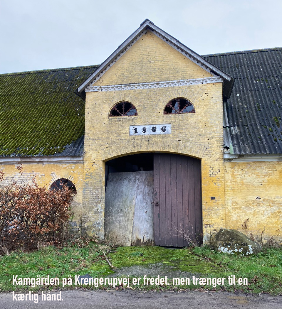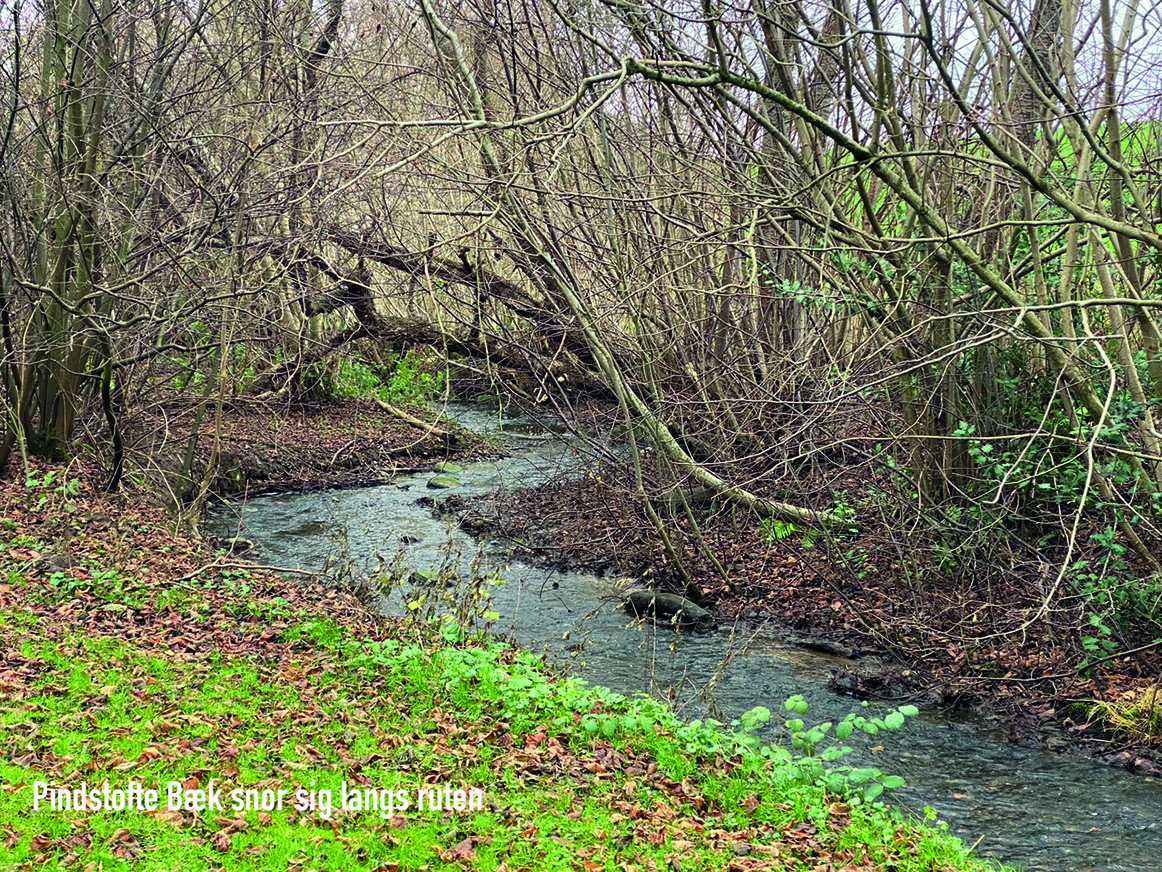 Jeg har ikke gået mange hundrede meter, før der vises af mod venstre, og jeg kommer til turens mest overraskende strækning, når det ikke er i Tommerup, man tager sine sædvanlige gåture. Her følger man på en lang strækning Pindstofte Bæk med udsigt til den anden side til de nederste huse på Vestervangen og Kamgårdsvej, her er ingen forstyrrende trafik, bare vandets rislen. Indtil man støder på Mølledamsvej, som leder ud til Krengerupvej. Nu er vi tilbage på gader og veje. Snart passerer vi Kamgaarden, engang en stolt proprietærgård, i dag fredet, men en skygge af sig selv.